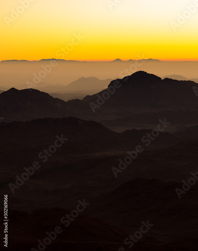 © Mountains Hunter, Obraz premium Amazing Sunrise at Sinai Mountain, Beautiful dawn in Egypt, early morning view of the top of Mount Moses