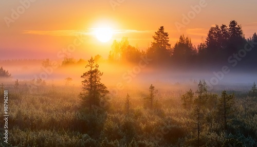 © blackdiamond67, Fototapeta premium Amazing Sunrise Over Misty Landscape. Scenic View Of Foggy Morning Sky With Rising Sun Above Misty Forest. Middle Summer Nature Of Europe