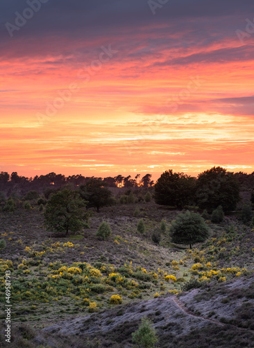© Jeroen Kleiberg, Obraz premium Amazing sunset over heather landscape with yellow flowers