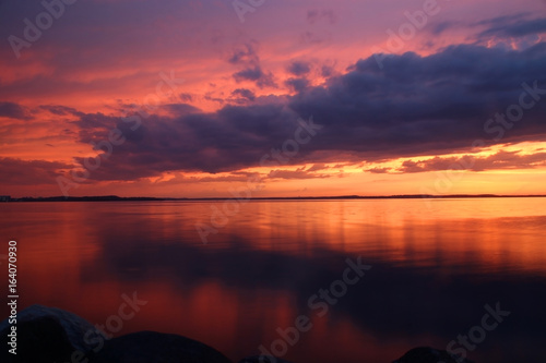 © Maryna, Fototapeta premium Amazing sunset over the lake.Landscape with a beautiful dramatic sunset sky after evening storm reflects in lake Mendota in the city of Madison Tenney Park,Wisconsin,USA.Long exposure horizontal shot.