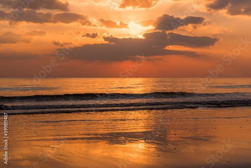 Naklejka premium Amazing sunset over the ocean. Beautiful clouds and sun. Bright colors.