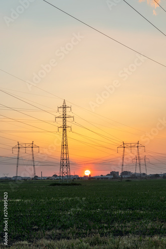 Fototapeta premium Amazing Sunset view over High-voltage power lines in the land around city of...