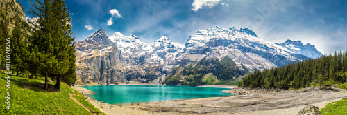 Naklejka premium Amazing tourquise Oeschinnensee with waterfalls in Swiss Alps