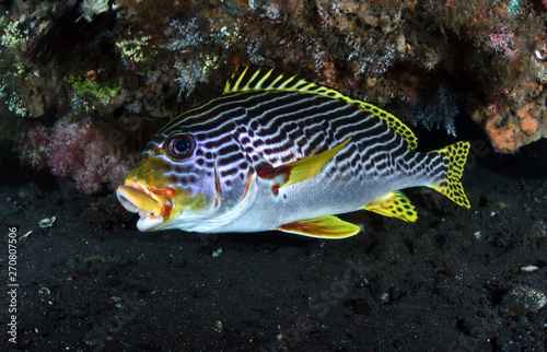 Naklejka premium Amazing underwater world - Oriental Sweetlip (Plectorhinchus vittatus). Liberty wreck, Tulamben, Bali, Indonesia.