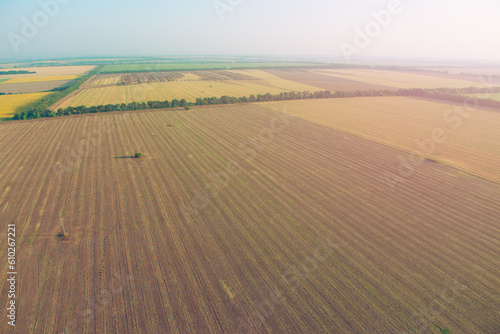Naklejka premium Amazing view from the height of the balloon. Summer beautiful fields lanscape from the bird's eye, sunrise. Ballooning in Ukraine