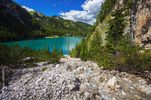 Fototapeta premium Amazing view of Braies Lake (Lago Di Braies, Pragser Wildsee) in Northern Italy.