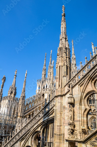 © Dmytro, Fototapeta premium Amazing view of Cathedral roof Duomo di Milano, Beautiful luxurious top of Cathedral with rows of Gothic pinnacles and sculptures on the sky background. It is a main landmark of Milan, Italy