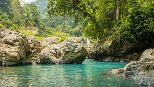 Naklejka premium Amazing view of river with clear blue water with rocks and tropical forest...