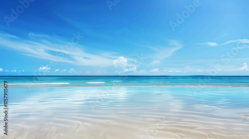 Obraz premium Amazing view of the beach with white sand and blue water. Clear blue sky with some clouds on the horizon.