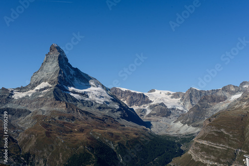Fototapeta premium Amazing View of the mountain Matterhorn, Zermatt, Valais in the Swiss Alps, blue sky, no clouds in early autumn.