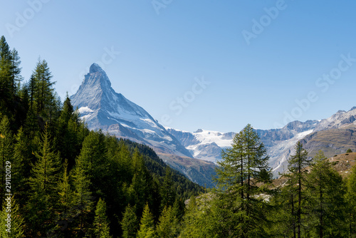Fototapeta premium Amazing View of the mountain Matterhorn, Zermatt, Valais in the Swiss Alps, blue sky, no clouds in early autumn.