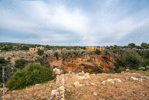 © Selcuk, Fototapeta premium Amazing views from Kanlıdivane (ancient Canytelis), which is an ancient city situated around a big sinkhole in Mersin, Turkey.