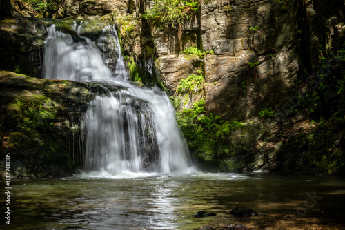Obraz premium Amazing water cascade on stony creek in sunny summer forest