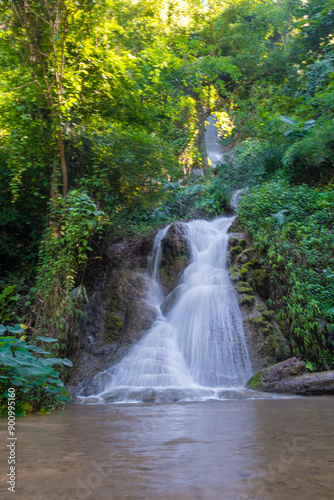 © themorningglory, Obraz premium Amazing waterfall in tropical forest sun light on green tree nature landscape
