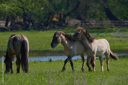 © Tom, Fototapeta premium Amazing wild horses on wild meadow in early spring.