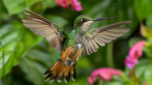 © Muhammad, Fototapeta premium Amazon Black-eared Fairy hummingbird in mid-flight, its wings and body creating a dynamic scene