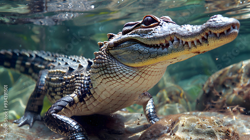 Obraz premium Amazon Dwarf Crocodile swimming in clear waters, its distinctive body and...
