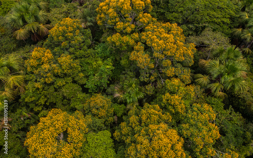 Naklejka premium AMAZON FOREST IN THE PERUVIAN JUNGLE WITH TREES WITH YELLOW FLOWERS