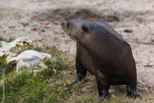 Fototapeta premium Amazon giant otter walking on land after coming out of the water