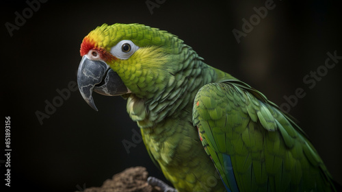 © hifi, Obraz premium Amazon Parrot Perched on a Branch with a Dark Backdrop.