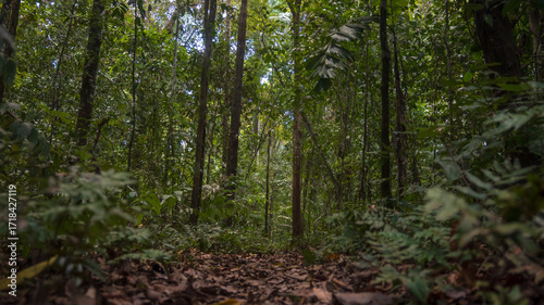 Fototapeta premium Amazon rainforest in Madre de Dios, near the Tambopata National Reserve, a lush forest full of trees and a path surrounded by biodiversity in the south of Peru