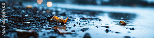 © Lila Patel, Obraz premium Amber Fragment on Wet Pebbles near Water