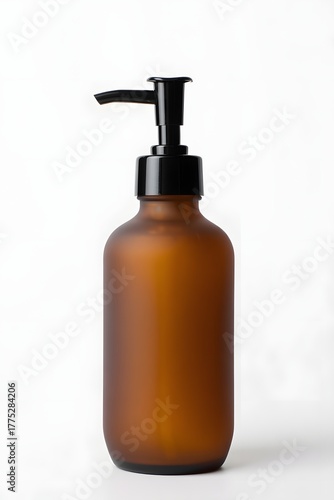 Fototapeta premium Amber glass bottle with black pump dispenser for lotions and soaps on white...