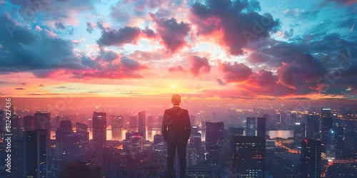 © Thares2020, Fototapeta premium Ambitious Entrepreneur Overlooking Glowing Cityscape at Dramatic Sunset with Inspiring Clouds Above Vast Metropolis Skyline