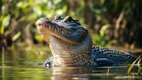 Obraz premium American Alligator basking in the marshland sunlit river habitat