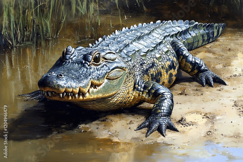 © Johanddss, Obraz premium American Alligator Resting Near Water Vegetation