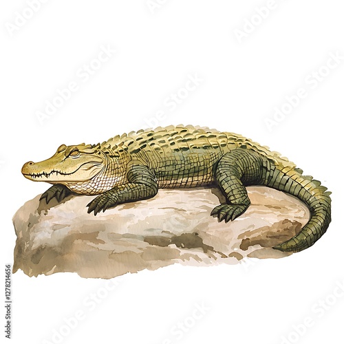 © NatthaphonSiri, Naklejka premium American Alligator Resting on a Rock - Watercolor Illustration.