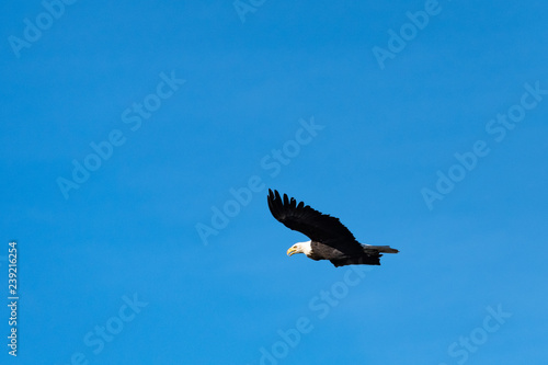 © knelson20, Fototapeta premium American bald eagle flying in a clear blue sky