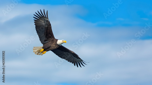© ZAY WIN HTAI, Fototapeta premium American bald eagle soaring against blue sky.