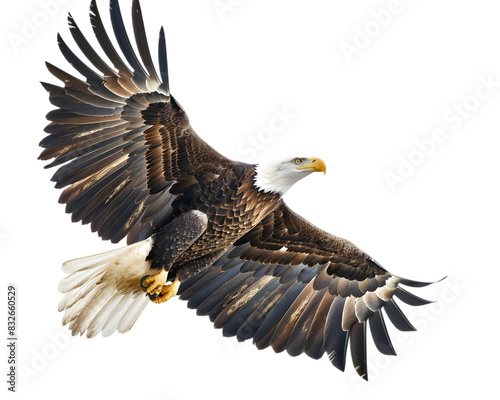 © PNG River Gfx, Obraz premium American bald eagle with open wings flight on transparent background
