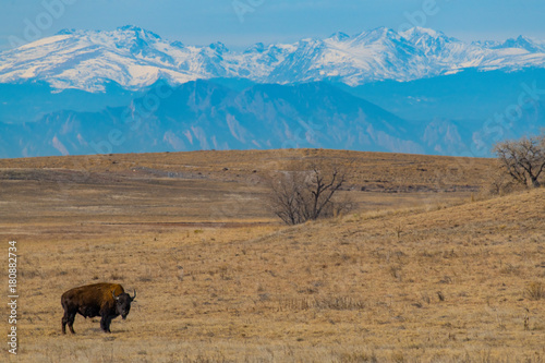 © Kerry Hargrove, Fototapeta premium American Bison Grazing on the Colorado Prairie with a Mountain View