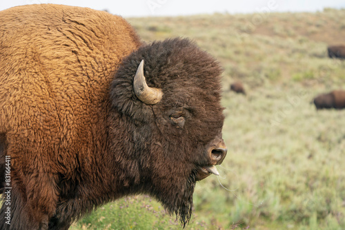 Fototapeta premium american bison head shot with blue tongue in Yellowstone park