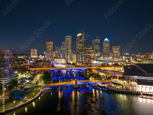 © bilanol, Obraz premium American city skyline of Tampa in Florida. Brightly illuminated commercial buildings and highway bridge over Hillsborough river. Night urban landscape of downtown district in USA.
