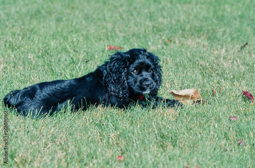 © SuperStock, Fototapeta premium American Cocker Spaniel puppy outside laying in yard with pig's ear chewy