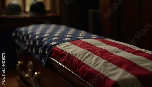 © Fili Creator, Naklejka premium American flag draped over wooden object symbolizing remembrance