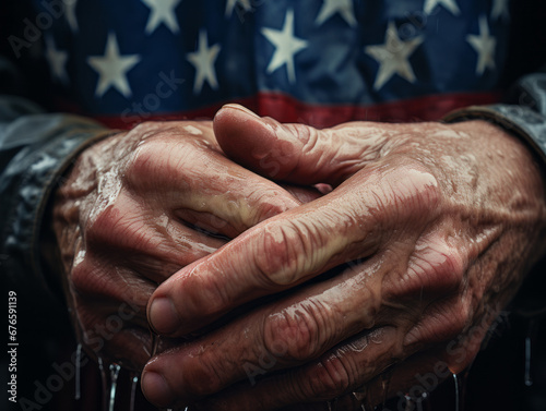 © Dawid, Fototapeta premium American Flag in Weathered Hands with Raindrops
