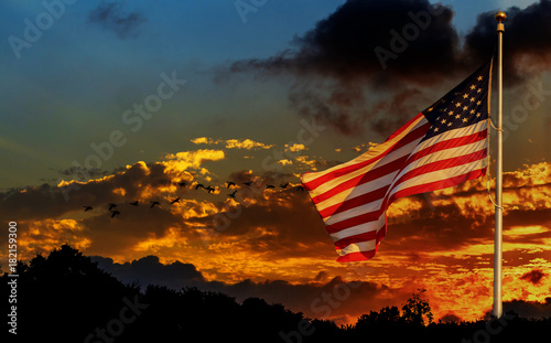 © ungvar, Obraz premium American flag na maszt macha na wietrze American flag przed jasnym niebie