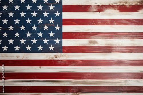 Naklejka premium American flag on bleached wooden planks, grunge vintage effect, AI Generated
