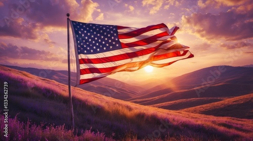 © BONDET LUCKY, Obraz premium American Flag Sunset Landscape Photography
