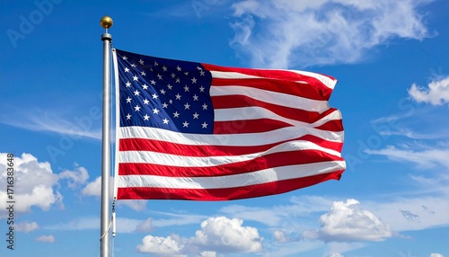 © Foundry, Naklejka premium American flag waving against bright sky, symbol of national pride and unity.