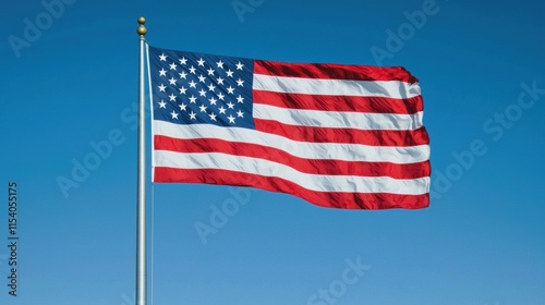 Fototapeta premium American Flag Waving Against Clear Blue Sky in Bright Sunlight