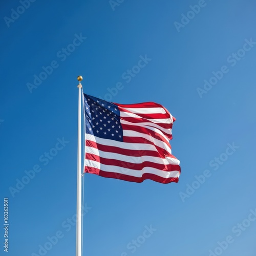Naklejka premium American flag waving high against clear blue sky. Flag on white pole flies proud with red, white, and blue stripes. Symbol of US, American nation, freedom, independence.