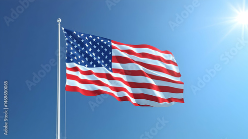 Fototapeta premium American flag waving in the clear blue sky under a sunny atmosphere render