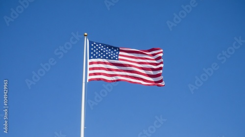 Fototapeta premium American flag waving in the wind against a blue sky.