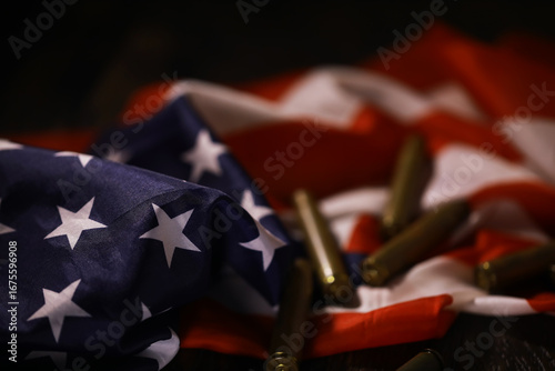 © alexkich, Naklejka premium American Flag with Bullet Casings: Symbolizing Patriotism and Gun Violence in the USA