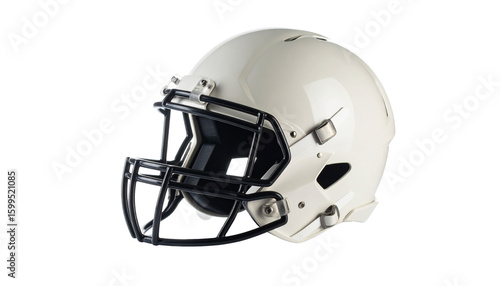Fototapeta premium American football helmet in white, isolated on white background, used for player protection.